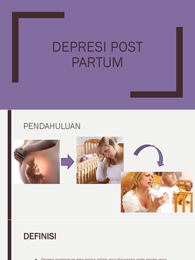 Menurut pillitteri dan regina (2001) dalam soep (2009), depresi postpartum adalah depresi pasca persalinan yang mulai terjadi pada hari ketiga setelah melahirkan dan berlangsung sampai. Tujuan penelitian ini adalah untuk mengetahui pengaruh factor internal dan eksternal terhadap tingkat depresi postpartum. Perempuan resiko tertinggi adalah mereka dengan sejarah pribadi depresi, episode sebelumnya depresi pasca melahirkan, atau depresi selama kehamilan. Yang digunakan adalah tingkat depresi. Sebuah video presentasi untuk mengedukasi masyarakat tentang depresi post partum agar masyarakat mengenali sehingga dapat lebih cepat mengatasinya.