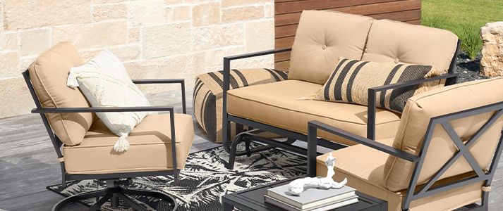Shop our wide selection of modern and traditional patio furniture including lounge sets, dining tables and chairs, gazebos and more. Shop our online patio furniture store for everything you need to furnish your outdoor space. Reserve the bulk of your outside hours for enjoying your living space as opposed to maintaining the furniture. With the right outdoor furniture, you can extend the uniqueness of your home to your outside space, whether that be a backyard or a small balcony. Enter your email address to receive alerts when we have new listings available for outside patio furniture on sale.
